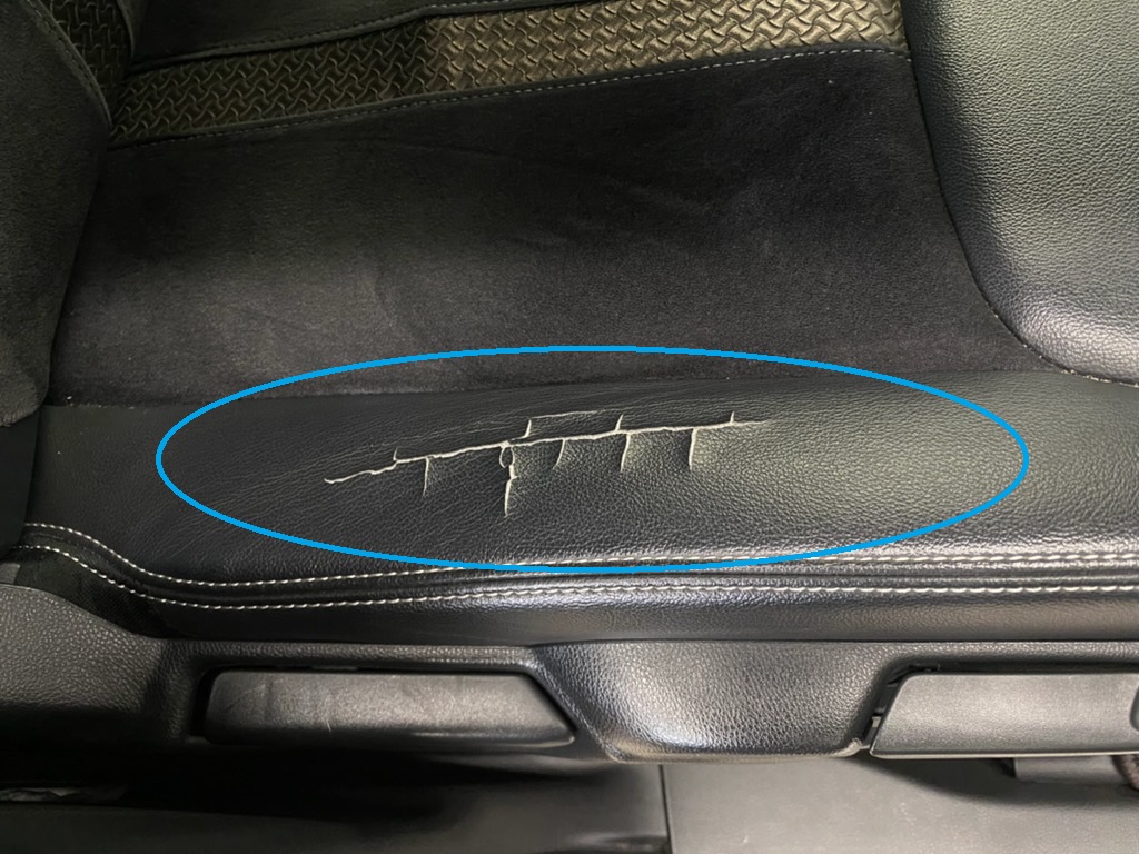 合成皮革の表面が基布から剥がれひび割れをおこしています、結構よくみる症例です