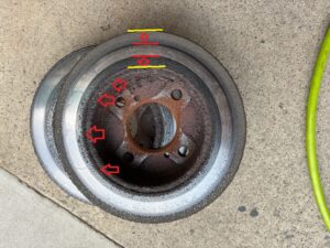 お車の外側、ホイールを外した際見えてる部分は比較的普通に見えますが裏側は写真の様に変摩耗していることがよくあります