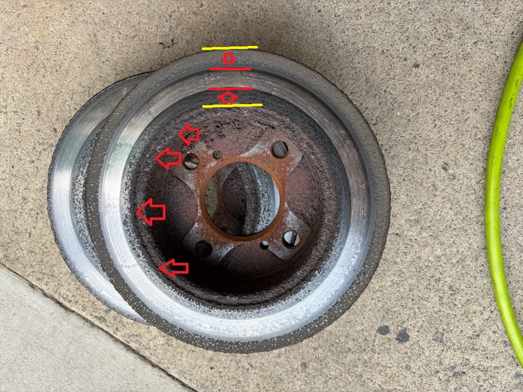 車に対し内側から見たものです、黄色線のローター幅に対しブレーキパッドの接触面が赤線の幅しかない状態です