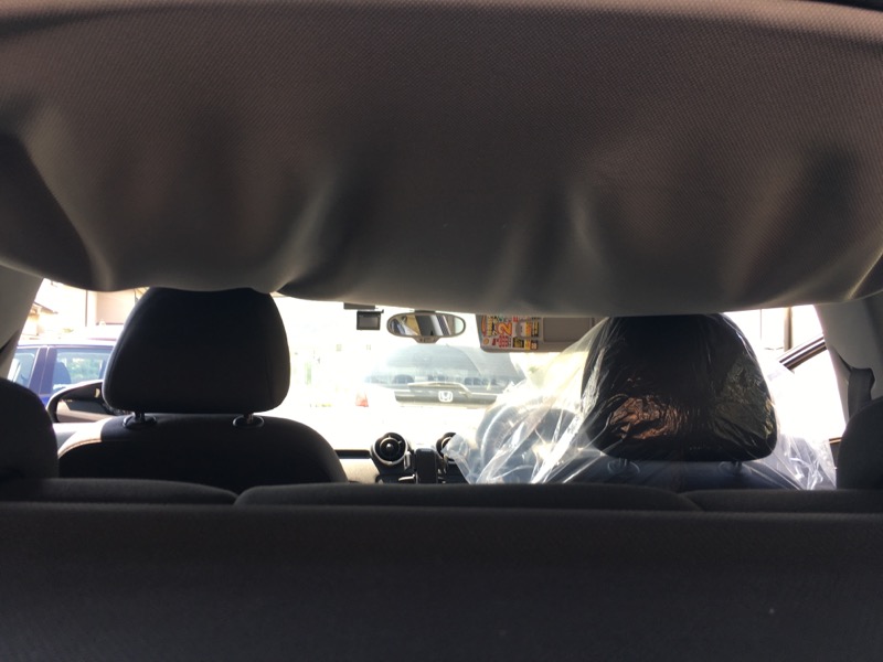 盛大に垂れてます!!頭のうえに垂れ下がった生地が付く程です。この状態はライニング脱着の途中に生地が完全に剥がれ落ちますので、車内を汚さないよう注意が必要ですね。