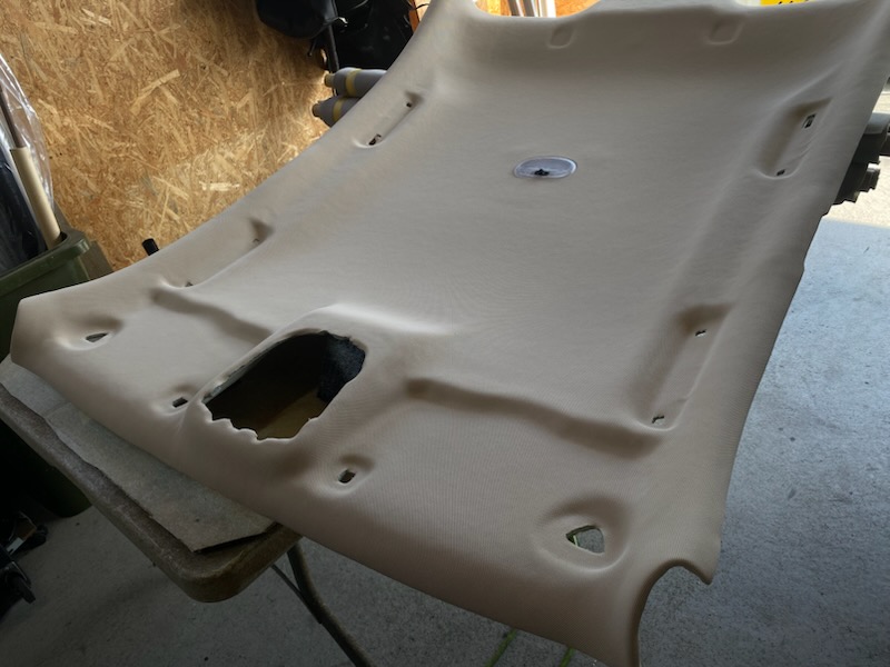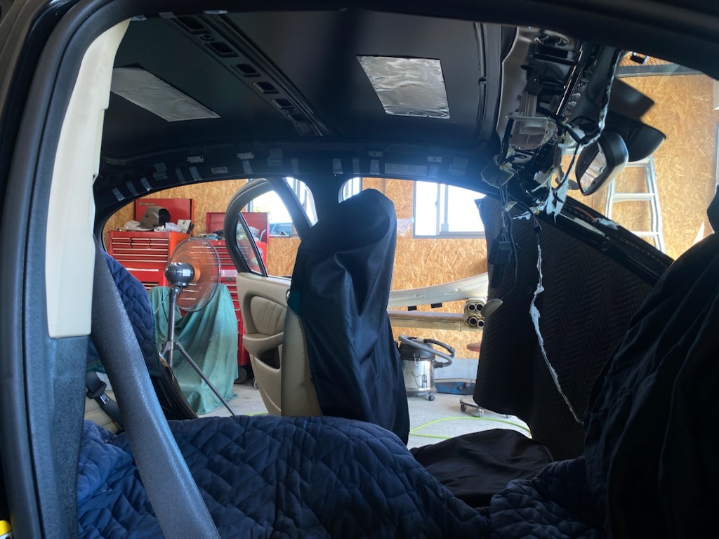 新しい生地に張替が終わり乾燥中です、この後再び車内に戻します